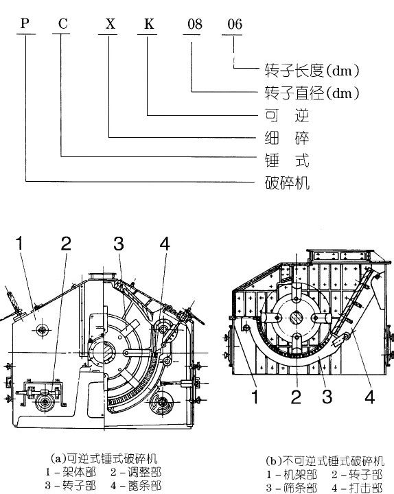 —破碎機(jī)分為左裝和右裝二種裝配形式,選用時(shí)若無(wú)要求,則按正常安裝圖供貨。右式裝配是指操作者面對(duì)機(jī)器轉(zhuǎn)子觀察口時(shí),電動(dòng)機(jī)安裝在右手側(cè)的形式,反之為左式裝配。